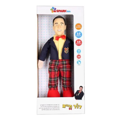 בובת דוד חיים יפה ואיכותית עם ראש פלסטיק כולל 10 שירים של דוד חיים ומגוון תכנים נוספים 2 עוצמות קול
